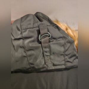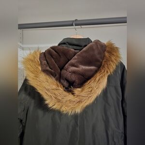 Universal Thread (Target Brand) water resistant parka size Large in green. Very long, I am 5'6" and it hits just above my knees. Fur lined removable hood (buttons) adjustable and oversized. 4 front pockets with button closures. Elastic cuff. Button and zipper front closure. Adjustable waist drawstring inside. Worn one time.