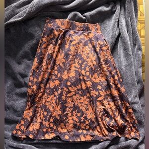 Stylish patchwork maxi skirt with floral and stripe patterns. Features pink, brown, and cream hues. Ideal for casual wear. Measurements: Overall length is approximately 34 1/2" long and top of stretchy waist band measures approximately 12 1/2” across.