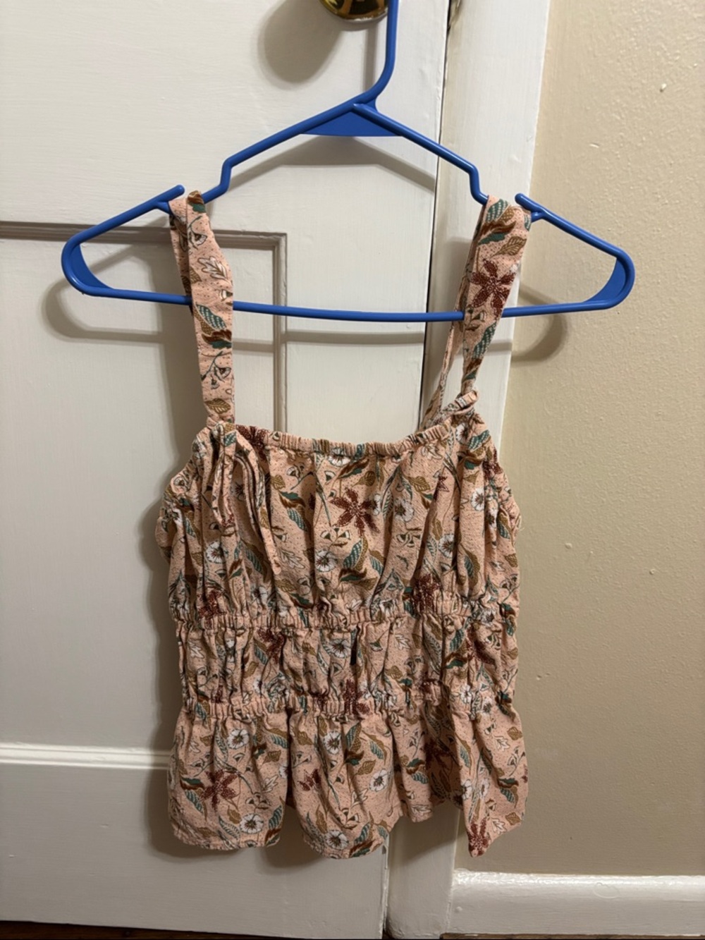 Sleeveless ruffled tank with thin adjustable straps. Peach background with small floral and leaf print. Soft, casual style for everyday wear.