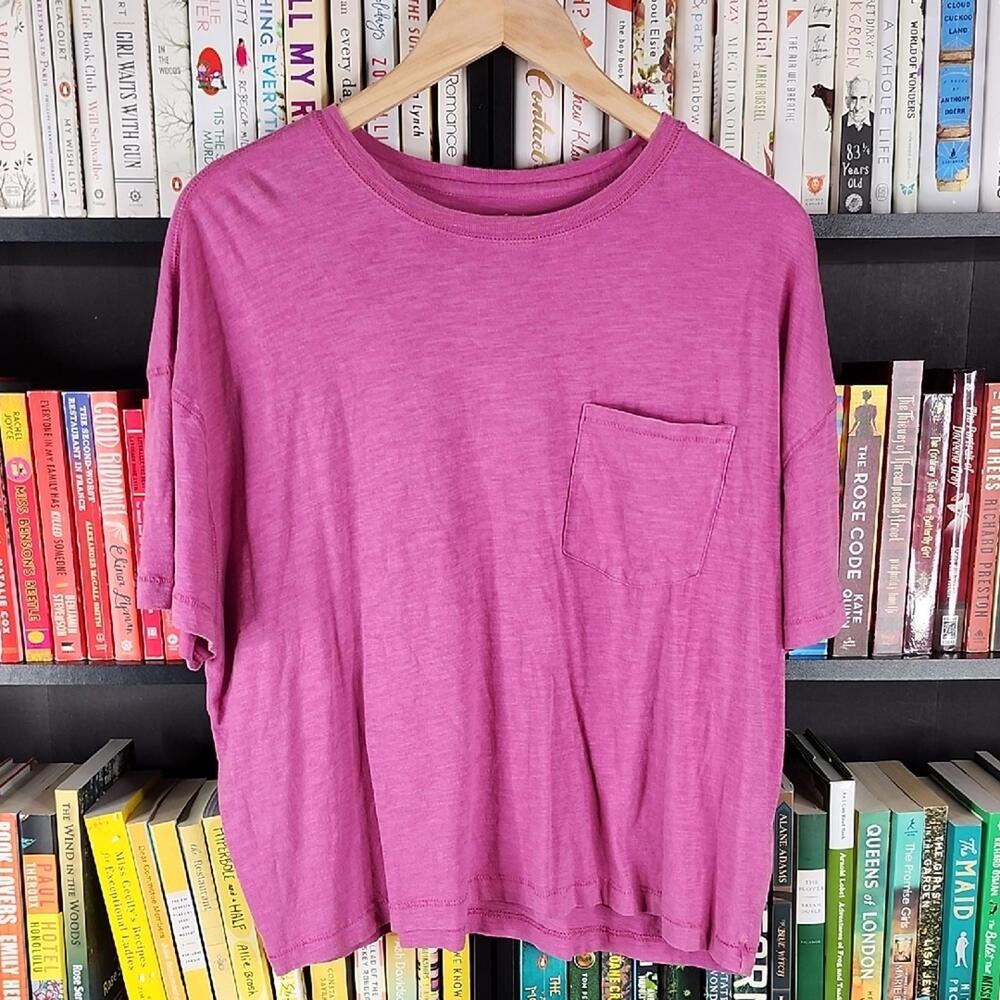 Casual pink tee with short sleeves. Features a front pocket. Soft and comfortable fabric.