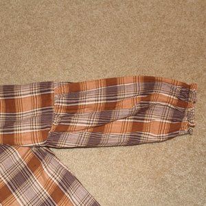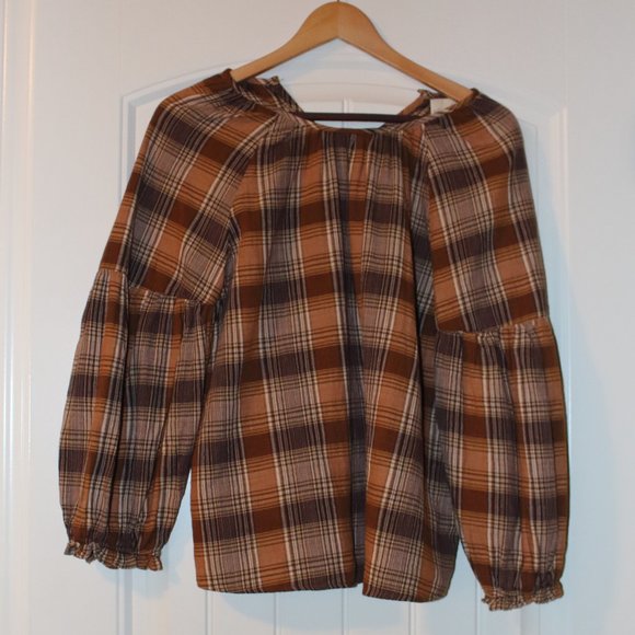 Universal Thread Balloon Sleeve Swing Top with Back Button Neck, size Small, Brown Plaid. 20 1/4" arm pit to arm pit laid flat, 24 1/2" top of shoulder to hem. Cotton. Worn Once. EXCELLENT CONDITION.