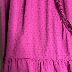 Plus size top in Fuchsia from Universal Thread. Long balloon sleeves. Wrap front with ties inside and out. Small ruffle trim at neckline. Ruffle peplum hem. Size XXL. See photos for measurements. Gently preowned condition with no tears or stains.