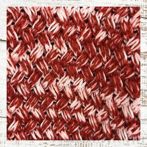 Orange / rust colored pullover crew neck sweater. Woven knit design. Multi color thread used with off-white bits in it.