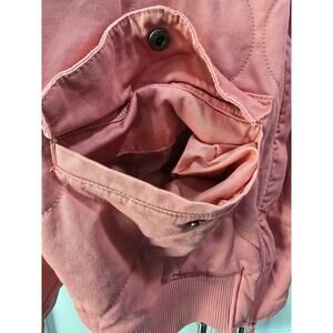 Cozy and stylish quilted bomber-style jacket in a warm coral pink tone. Perfect for layering during cool weather. Features front flap pockets, soft ribbed trim, and a thick quilted body for extra warmth.