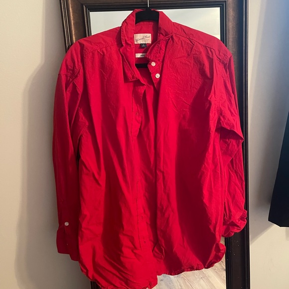 Bright red button-up shirt. Long sleeves with button cuffs. Classic collar design.