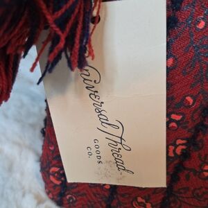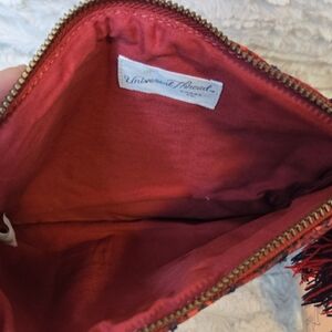 Chic red floral design. Textured fabric with tassel accent. Zipper closure for secure storage.