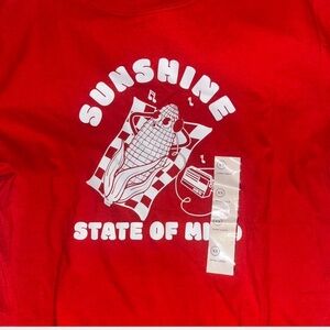 Vibrant red tee with 'Sunshine State of Mind' graphic. Casual and stylish.