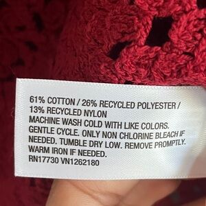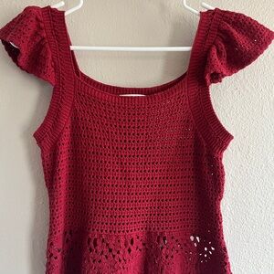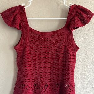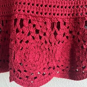 Elegant red knit top with intricate crochet design. Like new condition!