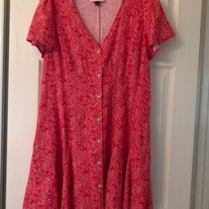 Chic mini dress with button-down front. Features short sleeves, pockets and a vibrant pattern.