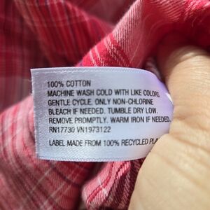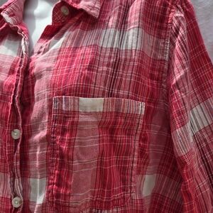 Stylish red plaid shirt with button-up front. Features a classic collar.