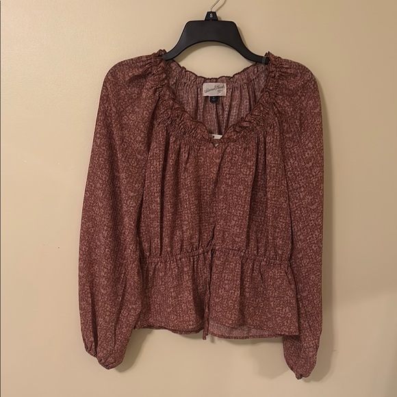 This Universal Thread blouse features a vibrant red hue with elegant ruffled and smocked details. The puff sleeves and bishop neckline add a touch of sophistication, making it a versatile piece for any occasion. Its lightweight fabric ensures a comfortable and stylish fit.