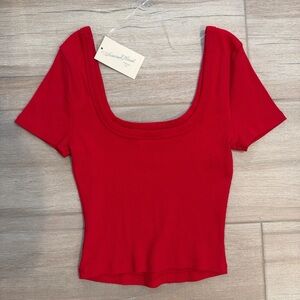 Fitted ribbed crop top with a deep scoop neckline. Short sleeves and stretchy knit for easy movement. Bold red color makes a statement.