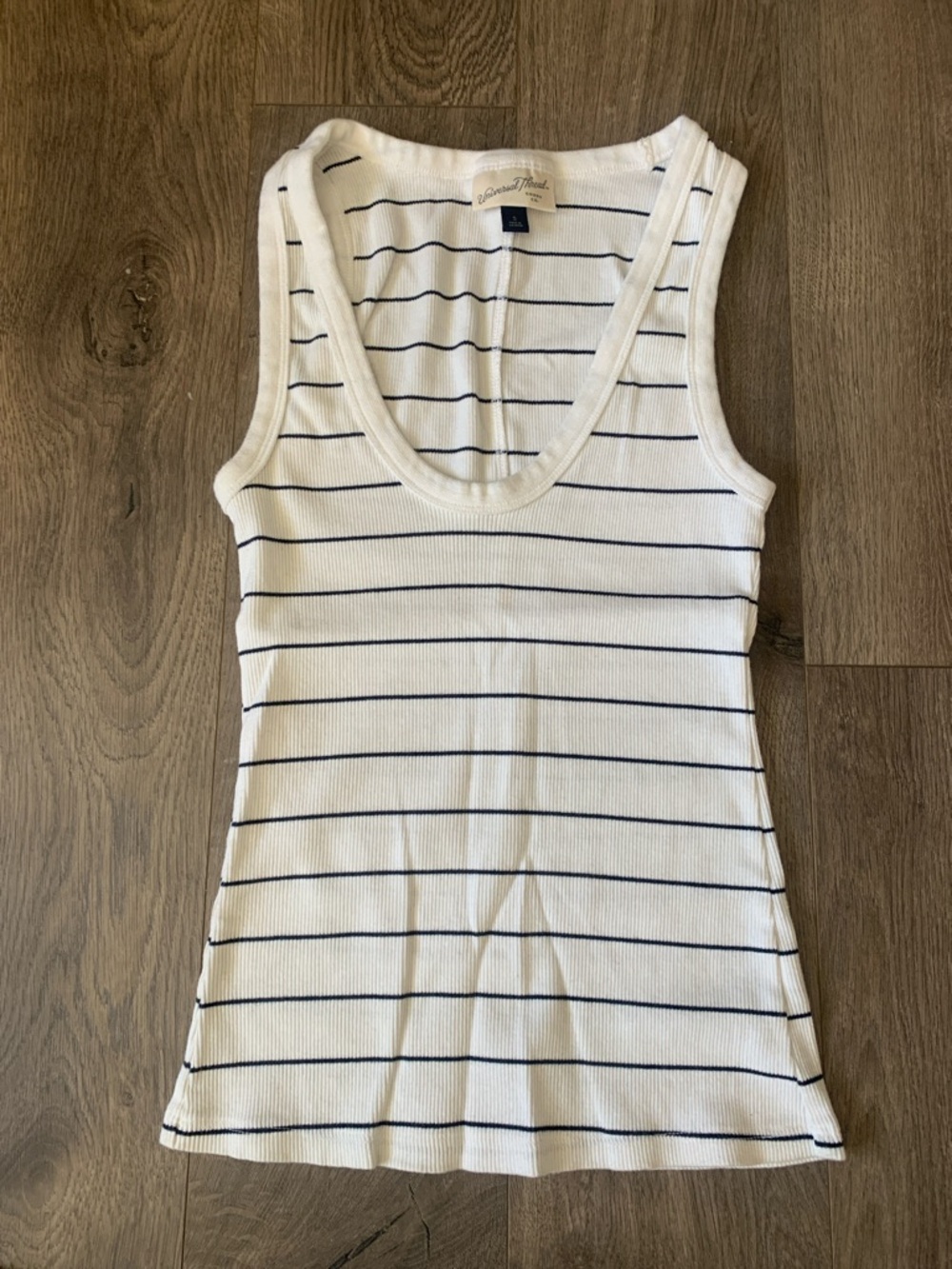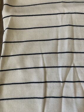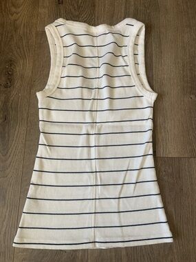 Soft ribbed tank with thin horizontal navy stripes. Scoop neckline and slim fit. Lightweight and easy to layer. Timeless striped look for casual wear.