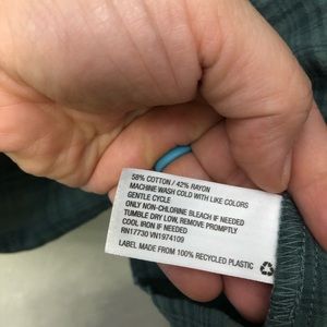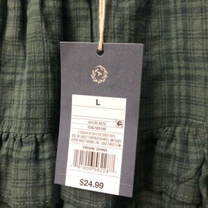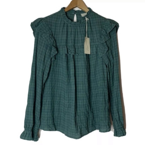 Universal Thread top in "teal" green plaid. Features ruffle detail on yoke, neckline, and shoulders. Keyhole closure at back neckline. 58% Cotton / 42% Rayon. New with tags. Size Large.