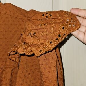 Step out in style with this elegant rust dress featuring charming ruffle details. Perfect for any occasion, this dress combines comfort and fashion effortlessly.