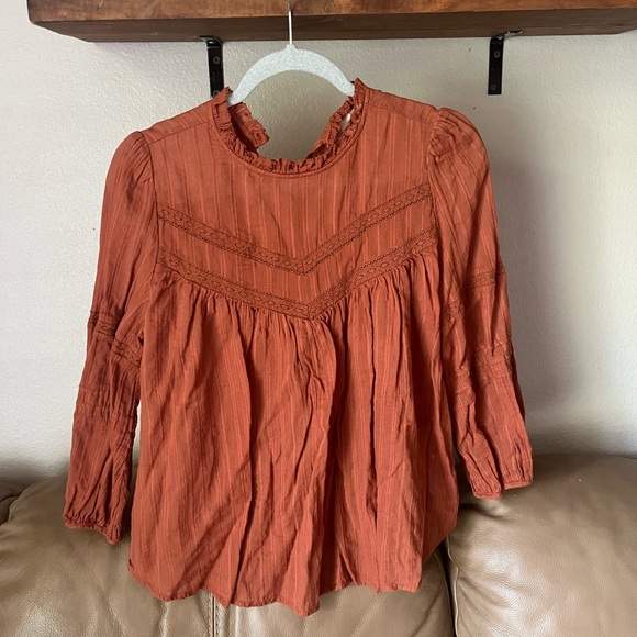 terracotta blouse with lace accents. Features a ruffled neckline and gathered sleeves. Fits more like a small vs xs in my opinion