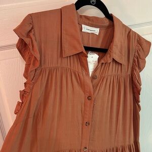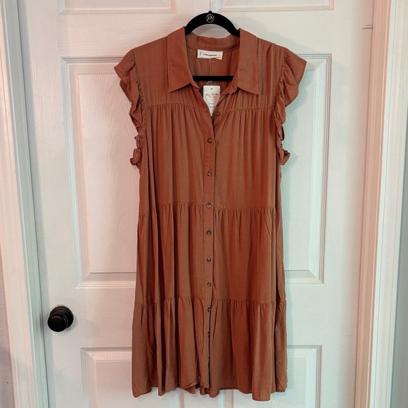 Rust midi dress with ruffled sleeves. Button-down design. Perfect for casual wear.