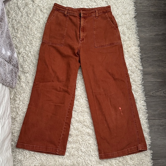 Stylish rust-colored capris. Features wide legs and front pockets. Perfect for casual wear. Slight bleach stain on right pant leg as shown in picture.