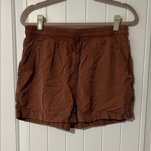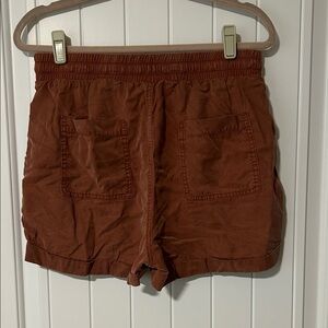 Faded rust color drawstring, shorts very soft loose fit. More of a mid rise to high rise fit. just need to be steamed