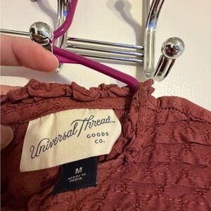 Elegant rust dress with textured fabric. Features long sleeves and ruffled hem. Perfect for casual outings.