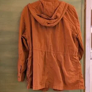 Stylish rust jacket with a hood. It features multiple pockets with snap closure. A drawstring allows a cinched waist.
