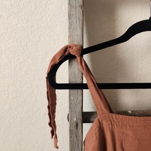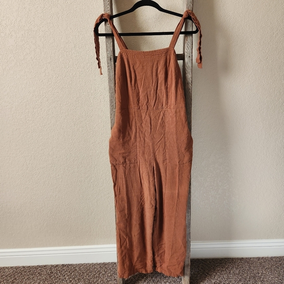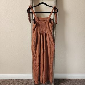Stylish rust jumpsuit with adjustable straps. Perfect for casual outings.