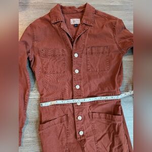 Stylish rust jumpsuit. Button-up front. Long sleeves. Comfortable fit.