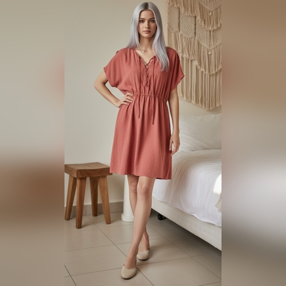 Stylish rust midi dress. Features a lace-up neckline. Comfortable and chic design.