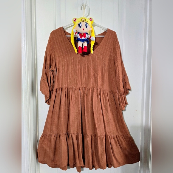 Chic rust mini dress with a tiered design. Features a V-neck and relaxed sleeves. Ideal for everyday wear.
