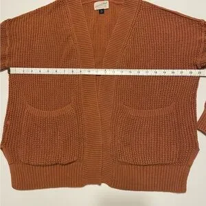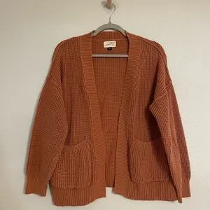 Chic open-front cardigan with textured knit. Features front pockets. Ideal for layering.
