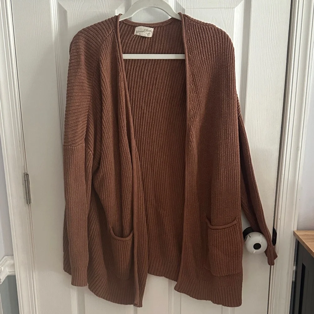 Cozy rust cardigan with open front. Features two front pockets. Ideal for layering.