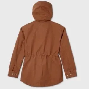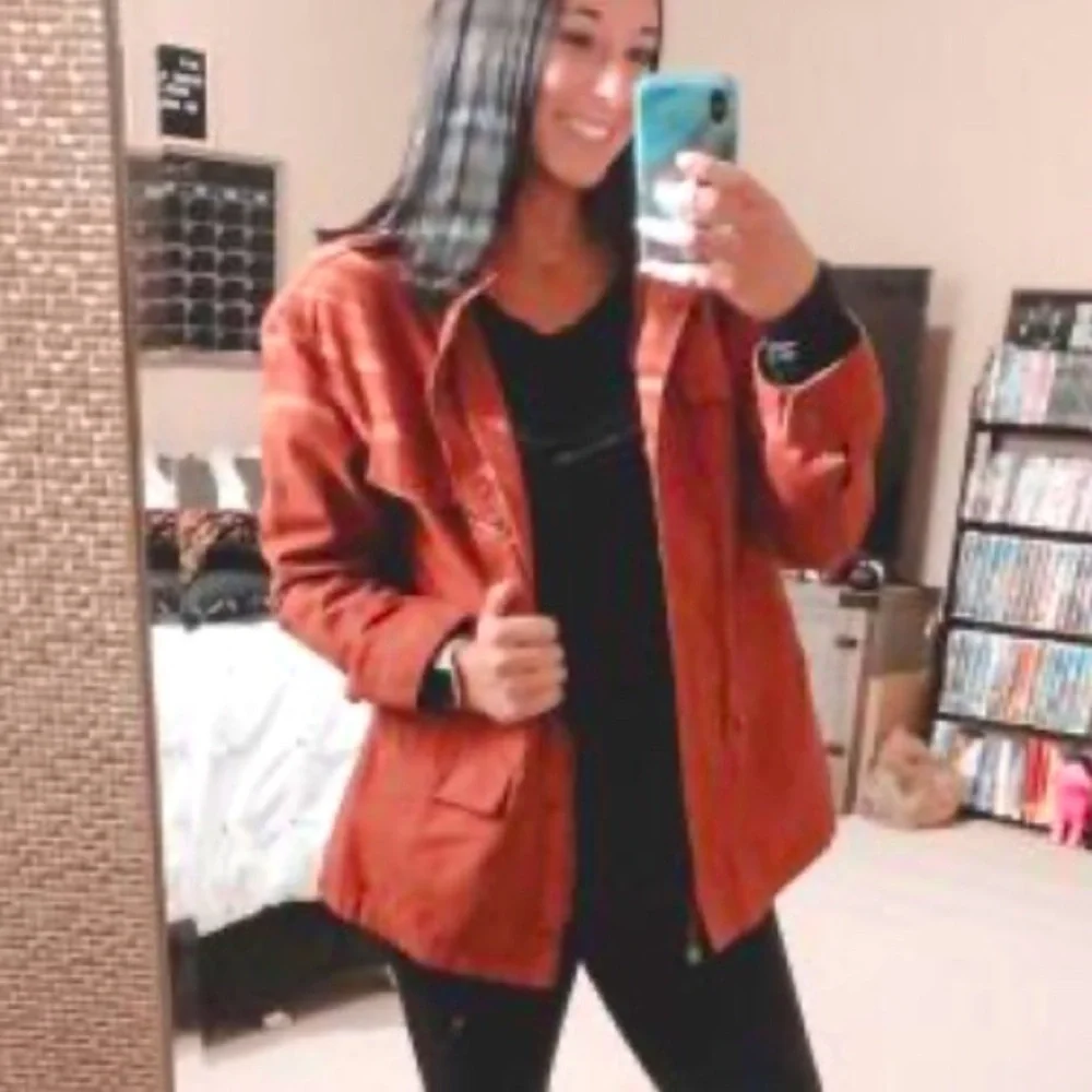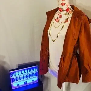 Stylish rust utility jacket. Features button closure and pockets. Perfect for layering.