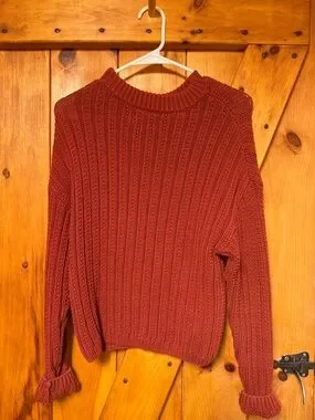 Soft ribbed knit pullover in a warm rust-red shade. Crew neckline. Relaxed, comfortable fit. Versatile casual style.
