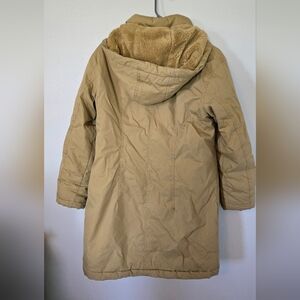 Color is kind of a brownish-sage green. I did find a stock photo which shows the color a little more accurately. Also, the fur trim is missing from the hood but the snaps are completely covered so it's not apparent.