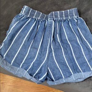 Blue shorts with white stripes. Elastic waistband. Loose around the thighs. High waisted.