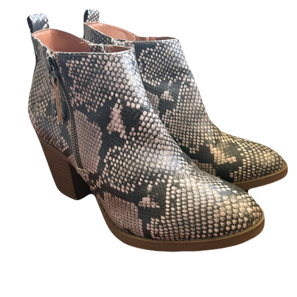 Stylish snakeskin pattern booties. Side zipper for easy wear. Perfect for any outfit.