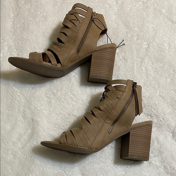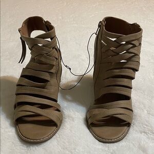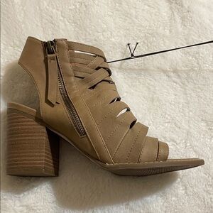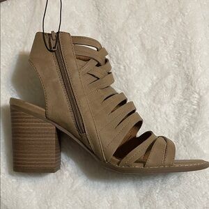 Stylish strappy shoes with a comfortable block heel. Perfect for any occasion. Please see pictures for details, NWOT but still connected with elastic string, never worn.