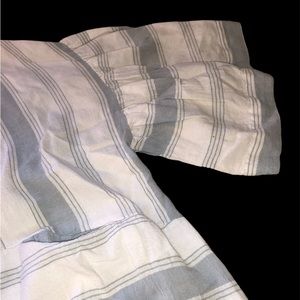Striped kimono style shrug with flared sleeves. Lightweight, one size. Large pockets on front