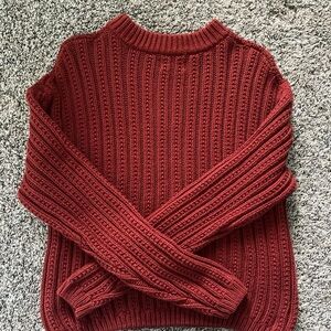 Mahogany ribbed knit sweater. This sweater is in excellent condition. This top is in a size extra small. has braided detailing on the sleeves. A little mesh.