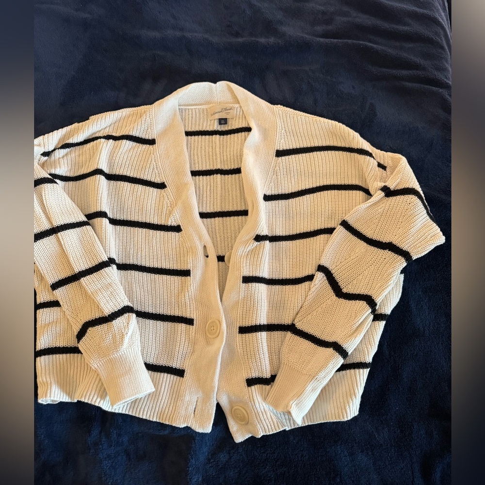 Slouchy fit, hits at hip. Loose weave. It’s either very dark navy, or black with light cream/white.