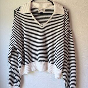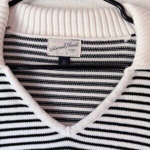 Universal Thread™ (Goods Co.) black-and-cream striped collared V-notch pullover sweater, size XL. Cozy midweight knit with a relaxed, slightly boxy silhouette and ribbed collar/cuffs/hem. Classic stripe pattern, drop-shoulder feel, and side slit at hem for easy movement. Fabric: 91% cotton / 9% nylon. Great with jeans, trousers, or layered over a tank. Washed but never worn.