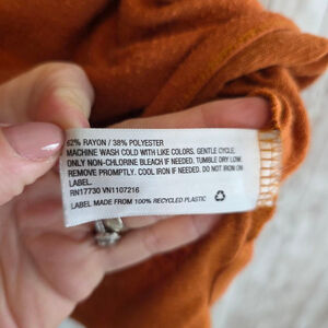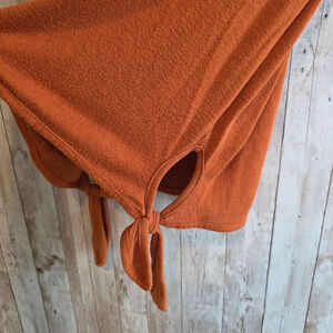 This is a pre-owned Universal Thread brand women's t-shirt, size XS. The shirt is a solid orange color and features short sleeves and a round neckline. It has tie details on the sides. The material is a blend of 62% rayon and 38% polyester. The shirt shows some signs of wear, including slight pilling throughout the fabric.