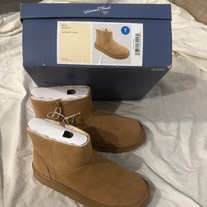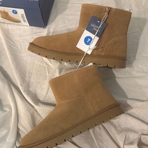New with tags and box. Stylish tan ankle boots. Comfortable and versatile. Perfect for casual wear. size 7 and brand is Universal thread. A classic must have in every closet