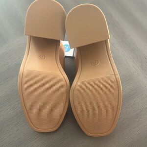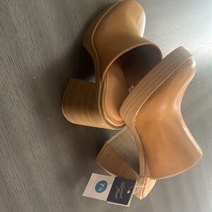 Stylish tan mules. Comfortable block heel. Slip-on design.