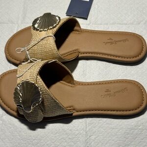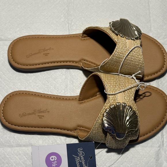 Stylish Universal Thread sandals with a woven tan design. Features elegant gold shell accents.