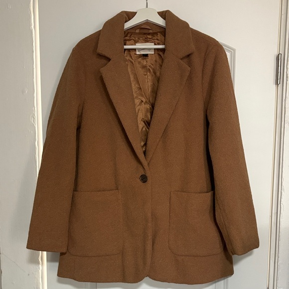 Chic tan blazer with a single-button closure. Features two front pockets. Ideal for layering.