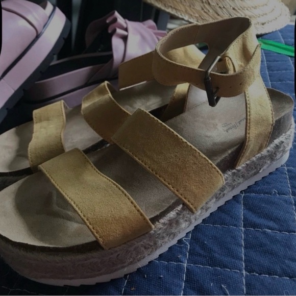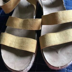 Chic and comfortable tan suede sandals. Features adjustable straps and a sturdy sole.