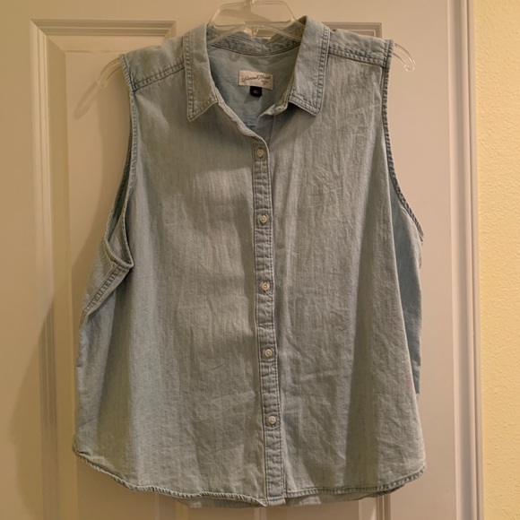 Light wash denim button up tank top. Some small pink stains on the front, might come out in wash.