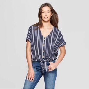 Universal Thread Tie Front Top Women’s Size XXL Blue Gray Striped Buttons V-Neck