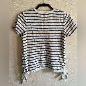 Universal thread short sleeve top with tie detail at the hips. White with navy stripes and navy diamond embroidered detail on the front. 100% cotton.